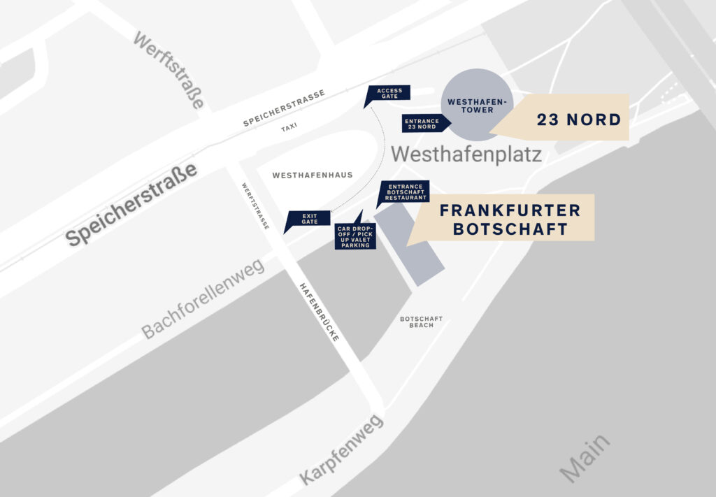 For your visit to our restaurant at the Frankfurter Botschaft (the building on the riverbank directly next to the Westhafen Tower), we recommend making a reservation in advance. You can submit your reservation via the online tool below.